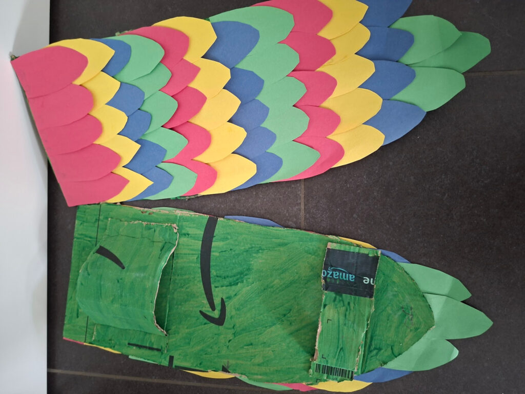 Barbara’s P3 class had their first assembly at her school, yesterday. She spent a fair amount of her own time building up wings using old construction paper and Amazon boxes: