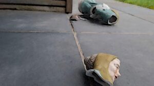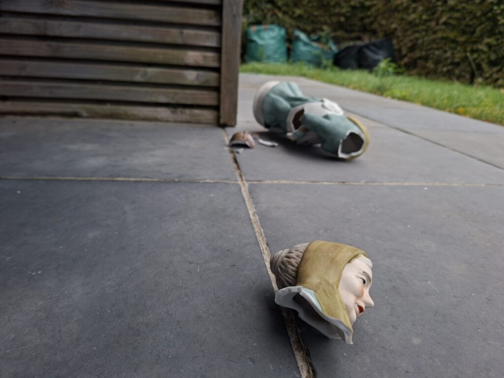 Shortly after I took the photos of the leaves, another round of wind and rain hit — including some sleet — and this time the wind was strong enough that it knocked over our ceramic statue of “Granny.”