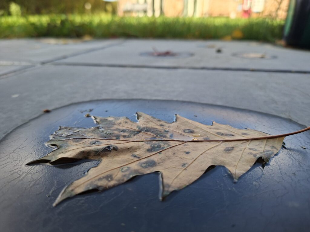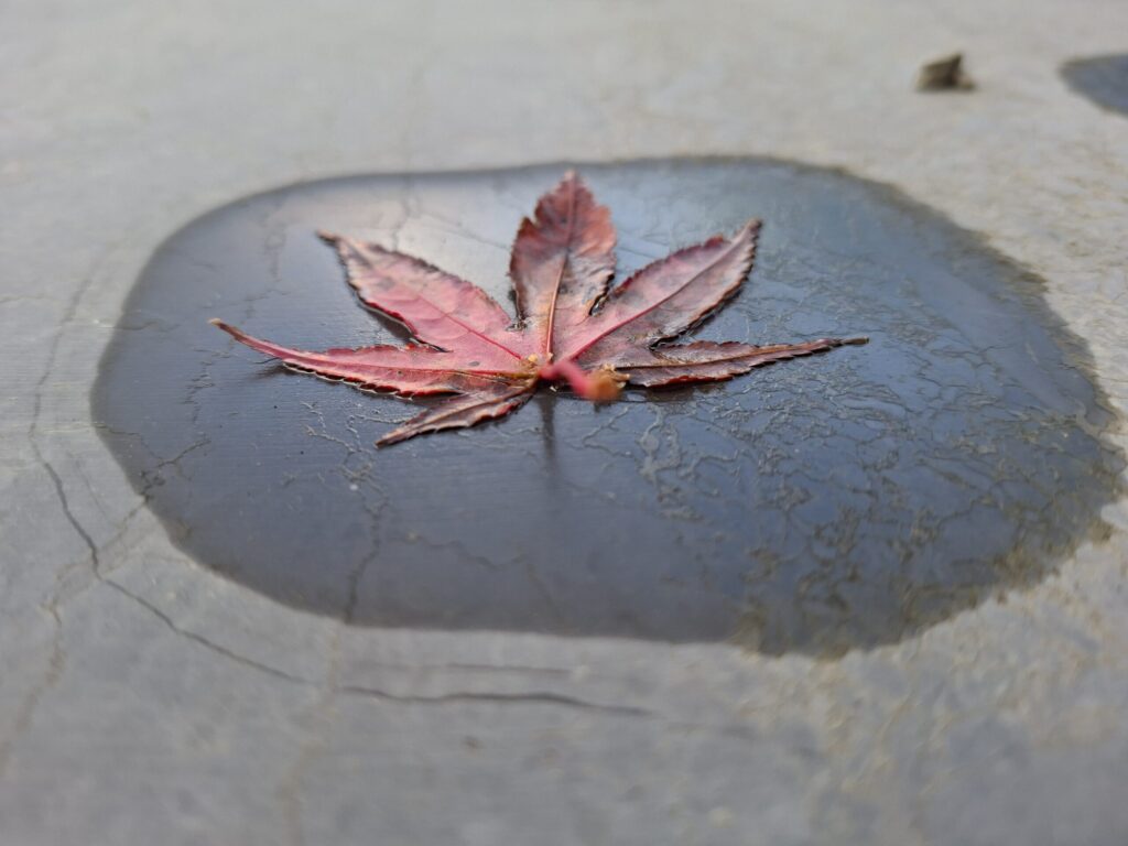 A bit of an addendum to the last post, after several rainy and very windy hours we now get mostly sunny day which is still quite windy. Doing a quick run around the house to check for damage, caught a fun effect where leaves blown about by the morning bluster had caught up on the cement and caused a kind of “attractor” force to protect the water from the sun and the wind and evaporation so there are these little micro-puddles around them.