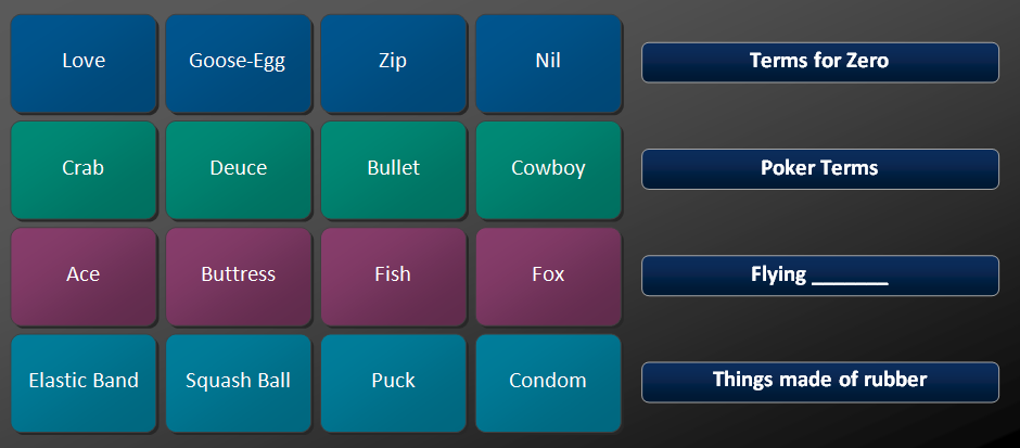 Kaz and I both enjoy playing New York Times’s Connections. It is a nice puzzle for me to solve each morning. However, I have been a bit irked at how much it obviously borrows from Only Connect‘s “Connecting Wall.”
