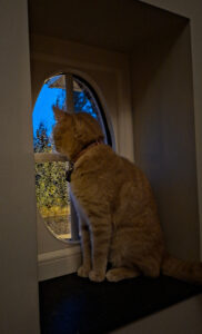 Pictured above is my cat, Turkey, pondering why the outside was so blustery. Taken in the moments right before sunrise [the light outside is mostly the streetlights but you can see the sky starting to lighten]. It’s a bit blurry because it was taken in fair darkness and it’s hard to get a photo of a cat while your phone is doing night-photo mode.