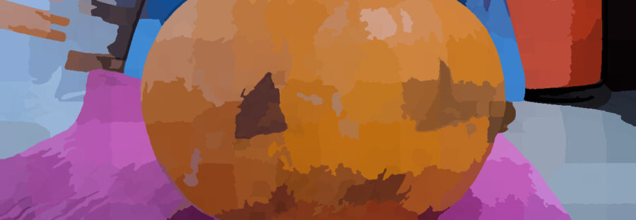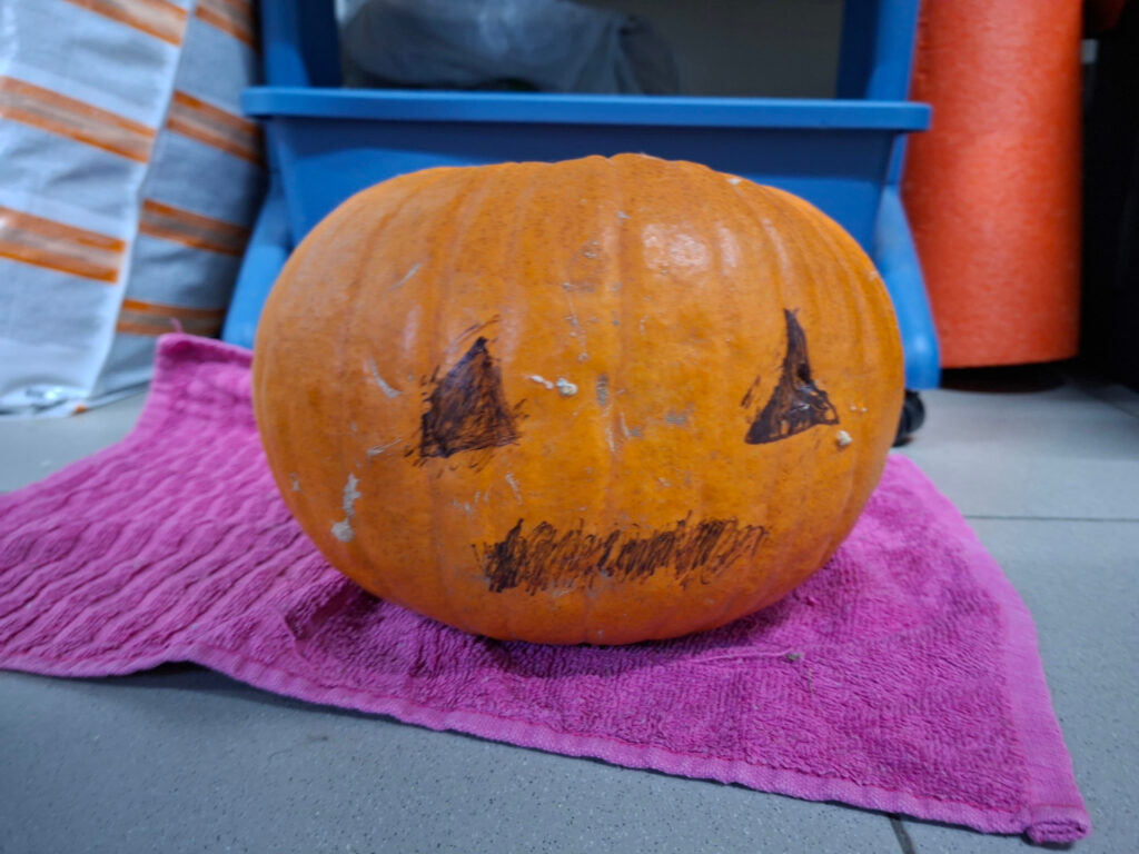 That’s “Sam,” my very quickly done pumpkin using Sharpie. I decorated him on Halloween evening and put him out in a chair with a little hat because it was quite chilly. The hat got deeply rained on so I tossed it into textile recycling but still have the pumpkin. Not sure what we’ll do with him. Maybe consign him into the garden and let nature take its course.