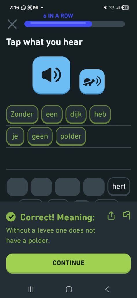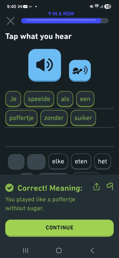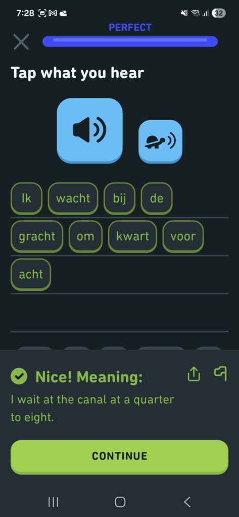 I think in technical terms I got added to some AB testing or whatnot. Who knows? It is kind of fun, though. The speaking and listening exercises are now less “De eend draagt geen schoenen” (the duck is not wearing shoes) and more, well…